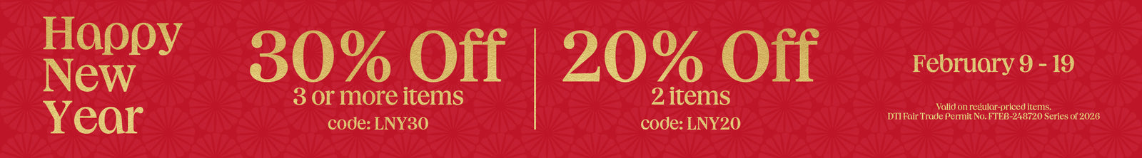 Lunar New Year: 30% off 3 or more, 20% off on 2 items