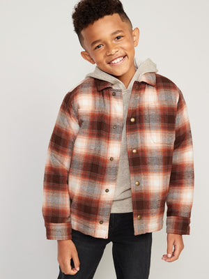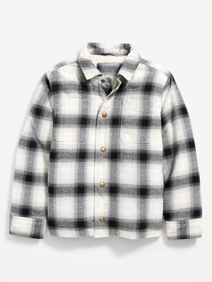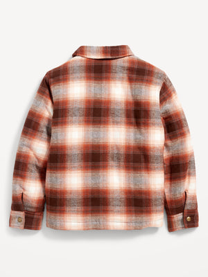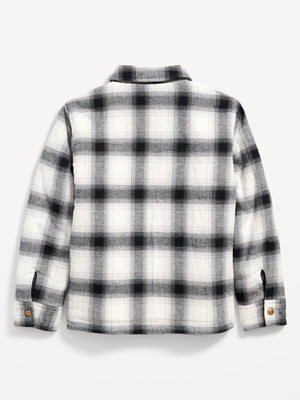 • Kids gender-neutral plaid flannel shirt jacket hits below waist.