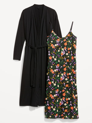 • Two-piece set includes bathrobe and matching cami nightgown.