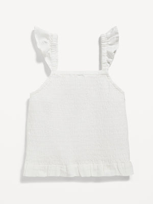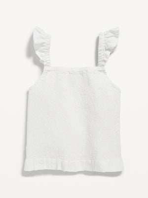 • Sleeveless arm openings, with flutter detail at shoulders.