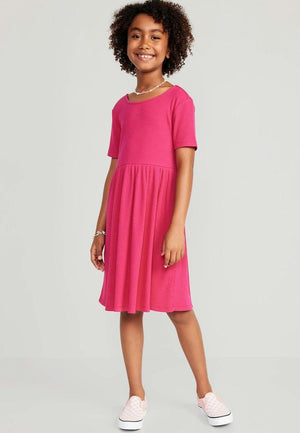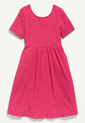 • Relaxed fit through body, with a defined waist. Girls short-sleeve dress hits approximately just above knee. Model is approximately 4'4" and wearing a size M (numeric size 8).