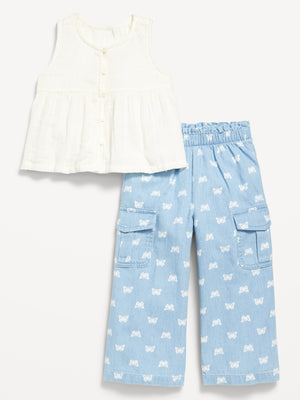 Sleeveless Button-Front Top and Cargo Pants Set for Toddler Girls