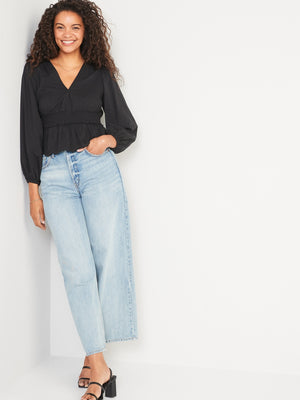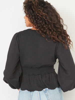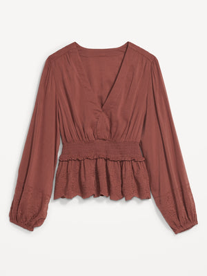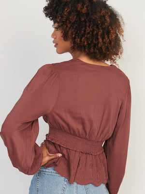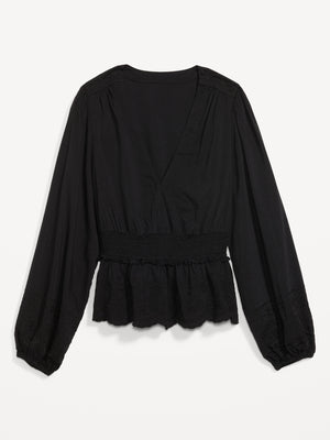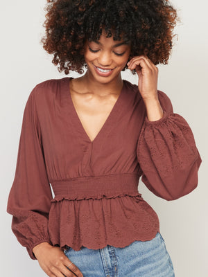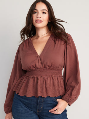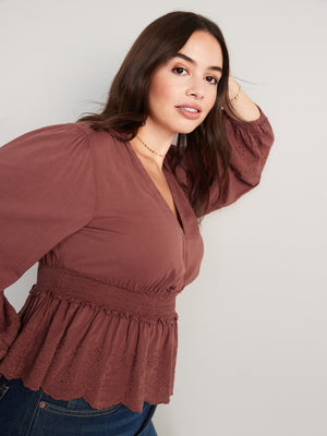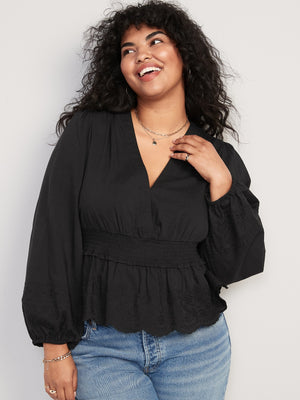 • Women's embroidered peplum blouse hits below waist.