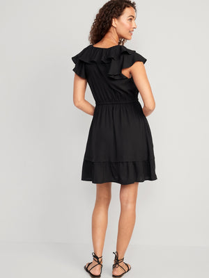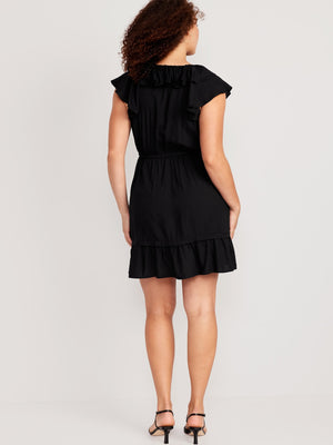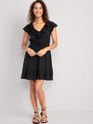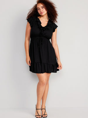 • Ruffled V-neck with decorative tie; short flutter sleeves.