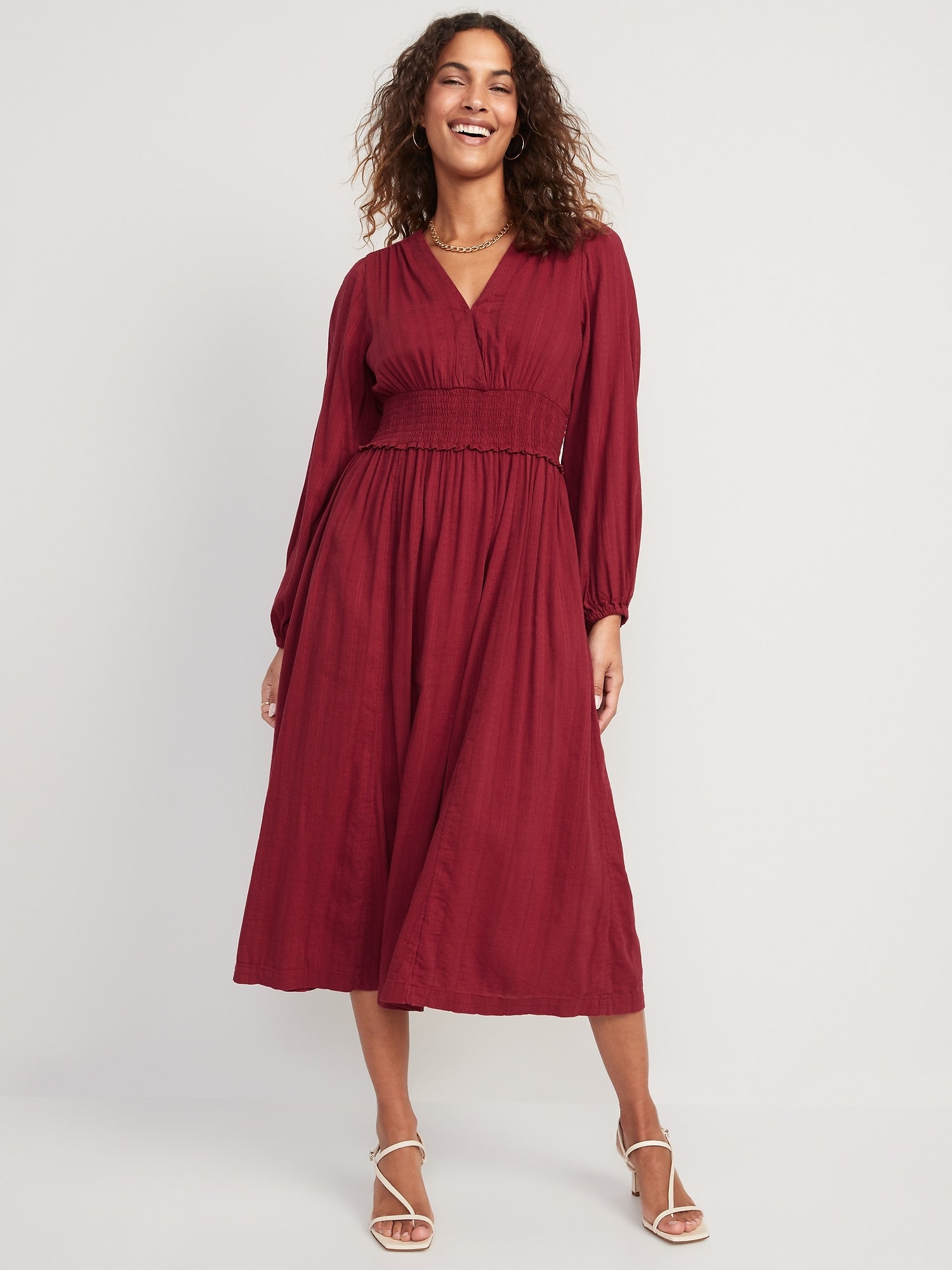 Waist-Defined Puff-Sleeve Smocked Midi Dress for Women