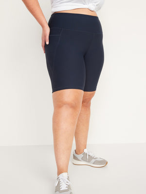 • Women's workout biker shorts hit just above knee.