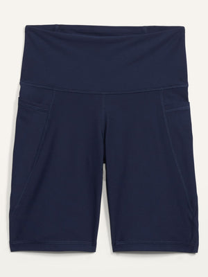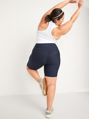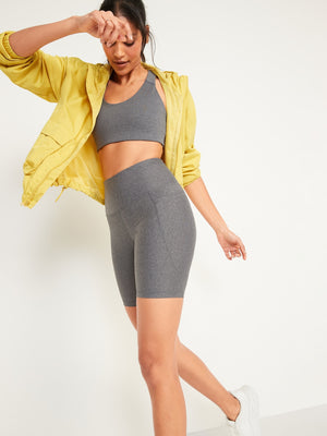 • High-waisted workout shorts sit high on waist.