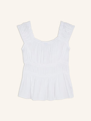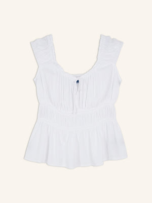 • Elasticized, ruffle-trimmed scoop neck, with keyhole tie fastening.