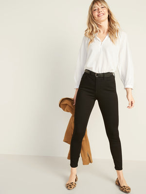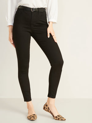 • Contoured high-rise waistband, with button closure and built-in belt loops.
