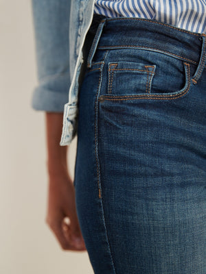 • Soft, dark-wash denim, with contrast topstitching and comfortable stretch.