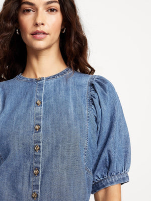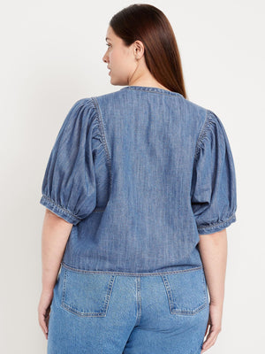 Puff-Sleeve Button-Down Cropped Denim Shirt