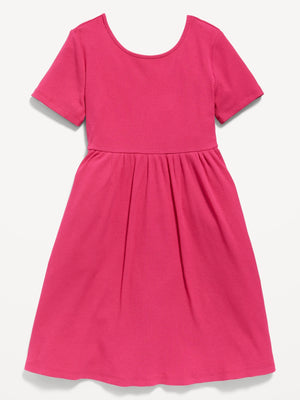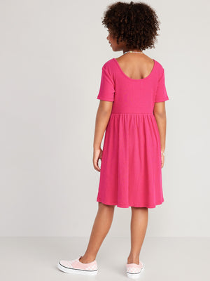 • Relaxed fit through body, with a defined waist. Girls short-sleeve dress hits approximately just above knee. Model is approximately 4'4" and wearing a size M (numeric size 8).