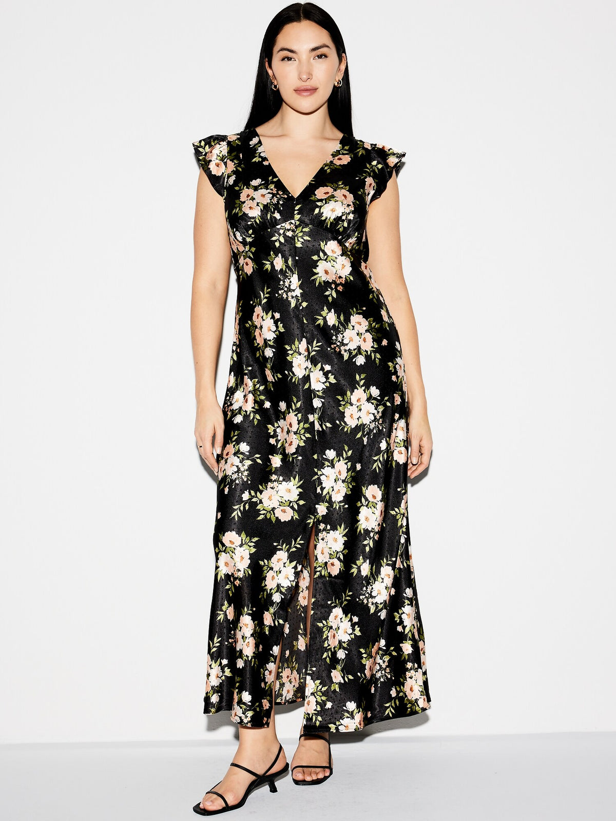 • body-skimming satin jacquard is cut on the bias for a perfect fit