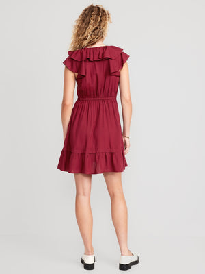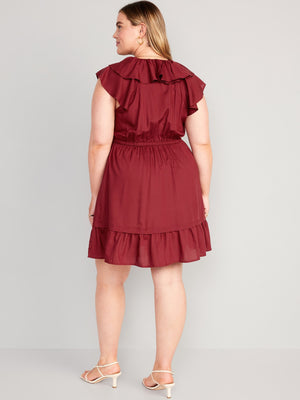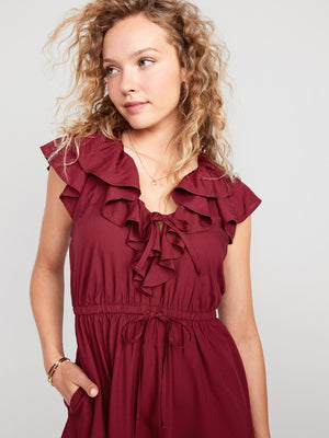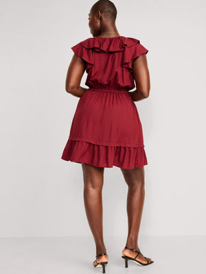 • Ruffled V-neck with decorative tie; short flutter sleeves.